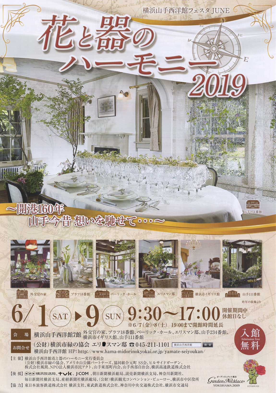 6月は恒例の「花と器のハーモニー」。今年は19回目、そして開港160年と言う節目に合わせ、「開港160年山手今昔 想いを馳せて・・・」がテーマです。