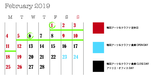 2月のスケジュールに変更がございますので、再び2月のカレンダーをアップロードいたしました。22日(金)倉庫はCLOSEです。23日と24日は開いてます。