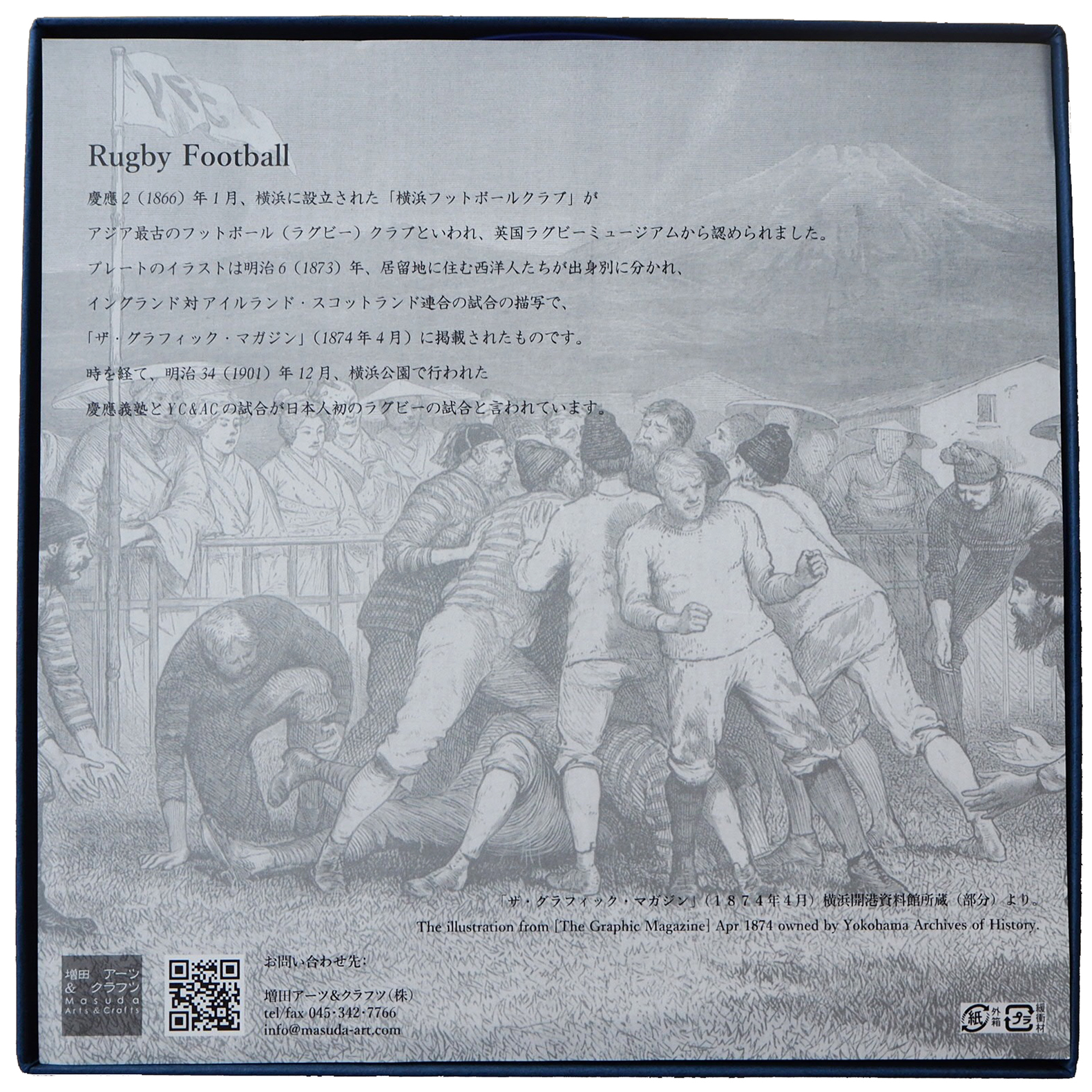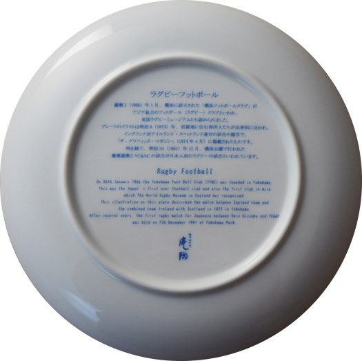 ラグビーフットボールプレートをひっくり返すと裏側にイラストの説明文が日本と英語で書かれています。(説明文の下に小さく「横濱増田窯・庵陶(アント)」)